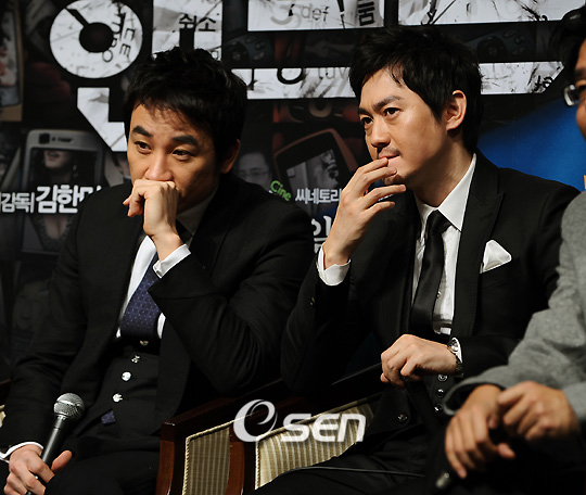 박용우,엄태웅이 주연하는 영화 '핸드폰'(김한민 감독) 제작보고회가 12일 시청앞 프라자 호텔 다이아몬드 홀에서 열렸다. 실제 경험을 모티브로 출발한 작품은 4년 동안의 치밀한 시나리오 작업을 바탕으로 핸드폰 분실 후 지옥 같은 128시간을 껵게 되는 한남자의 이야기를 담은 스릴러 이다. 엄태웅,박용우가 취재진의 질문에 심각한 표정으로 경청하고 있다./김영민 기자ajyoung@osen.co.kr