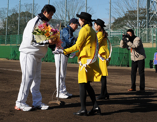 두산 베어스 선수단은 12일 전지훈련지인 일본 미야자키현의 사이토 구장에서 열린 환영식에 참석했다. 이날 오전 10시 두산의 전지훈련 연습장인 사이토 구장에서 열린 환영식에는 하시다 가즈미 사이토 시장과 관계자들이 함께 참석했으며, 지역 특산물인 돼지고기 10kg과 귤 10박스를 김경문 감독을 비롯한 선수단에 선물했다. 하시다 시장은 환영 인사 자리에서 "지난 2007년부터 이곳 사이토 구장에서 전지훈련을 실시하고 있는 두산베어스 구단에 다시 한번 환영과 감사의 인사를 전한다"며 "올해 두산 베어스가 이곳에서 좋은 훈련 성과를 거둬 한국시리즈 우승을 꼭 이루길 바란다"고 말했다. 김경문 감독은 "사이토시에서 항상 이렇게 좋은 환경에서 훈련할 수 있도록 배려해 줘서 고맙다. 올해는 지난 시즌보다 더 좋은 성적으로 보답하겠다"고 화답하며 구단에서 준비한 스프링캠프 모자와 홍삼 제품을 답례품으로 전달했다. farinelli@osen.co.kr 두산 베어스 제공.