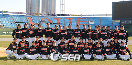 롯데 자이언츠가 새롭게 바뀐 유니폼 포토데이를 13일 오후 부산 사직구장에서 공개했다. 새롭게 바뀐 유니폼은 검정색 바탕에 팀 컬러인 오렌지색 선을 가미하여 보다 세련되고 활동적인 면을 강조, 가슴 중앙에는 기존 G로고 마크 대신 오렌지색 고딕체 디자인의 'GIANTS'로 교체했고 가슴 좌측 상단에는 영문 로고 'LOTTE'를 새겨 넣었다. 롯데 자이언츠 선수들이 새로운 유니폼을 입고 기념촬영을 하고 있다./부산=윤민호 기자ymh@osen.co.kr