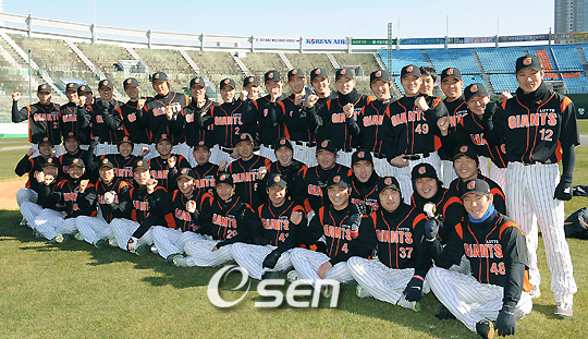 롯데 자이언츠가 새롭게 바뀐 유니폼 포토데이를 13일 오후 부산 사직구장에서 공개했다. 새롭게 바뀐 유니폼은 검정색 바탕에 팀 컬러인 오렌지색 선을 가미하여 보다 세련되고 활동적인 면을 강조, 가슴 중앙에는 기존 G로고 마크 대신 오렌지색 고딕체 디자인의 'GIANTS'로 교체했고 가슴 좌측 상단에는 영문 로고 'LOTTE'를 새겨 넣었다. 롯데 자이언츠 선수들이 새로운 유니폼을 입고 기념촬영을 하고 있다./부산=윤민호 기자ymh@osen.co.kr