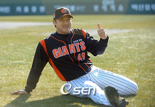 롯데 자이언츠가 새롭게 바뀐 유니폼 포토데이를 13일 오후 부산 사직구장에서 공개했다. 새롭게 바뀐 유니폼은 검정색 바탕에 팀 컬러인 오렌지색 선을 가미하여 보다 세련되고 활동적인 면을 강조, 가슴 중앙에는 기존 G로고 마크 대신 오렌지색 고딕체 디자인의 'GIANTS'로 교체했고 가슴 좌측 상단에는 영문 로고 'LOTTE'를 새겨 넣었다. 홍성흔이 새로운 유니폼을 입고 포즈를 취하고 있다./부산=윤민호 기자ymh@osen.co.kr