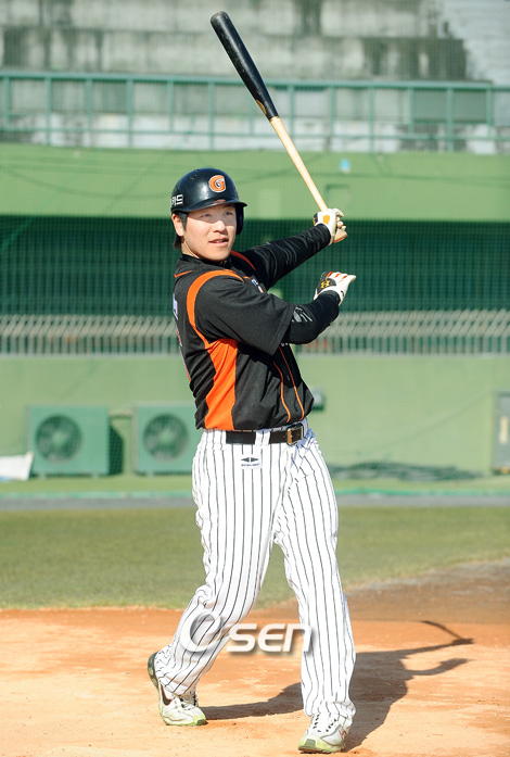 롯데 자이언츠가 새롭게 바뀐 유니폼 포토데이를 13일 오후 부산 사직구장에서 공개했다. 새롭게 바뀐 유니폼은 검정색 바탕에 팀 컬러인 오렌지색 선을 가미하여 보다 세련되고 활동적인 면을 강조, 가슴 중앙에는 기존 G로고 마크 대신 오렌지색 고딕체 디자인의 'GIANTS'로 교체했고 가슴 좌측 상단에는 영문 로고 'LOTTE'를 새겨 넣었다. 강민호가 새로운 유니폼을 입고 타격 포즈를 취하고 있다./부산=윤민호 기자ymh@osen.co.kr