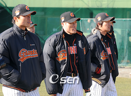 롯데 자이언츠가 새롭게 바뀐 유니폼 포토데이를 13일 오후 부산 사직구장에서 공개했다. 새롭게 바뀐 유니폼은 검정색 바탕에 팀 컬러인 오렌지색 선을 가미하여 보다 세련되고 활동적인 면을 강조, 가슴 중앙에는 기존 G로고 마크 대신 오렌지색 고딕체 디자인의 'GIANTS'로 교체했고 가슴 좌측 상단에는 영문 로고 'LOTTE'를 새겨 넣었다. 조성환과 박기혁이 다른 선수의 포즈를 지켜 보며 차례를 기다리고 있다./부산=윤민호 기자ymh@osen.co.kr