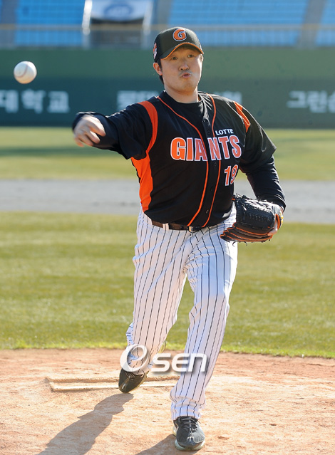 롯데 자이언츠가 새롭게 바뀐 유니폼 포토데이를 13일 오후 부산 사직구장에서 공개했다. 새롭게 바뀐 유니폼은 검정색 바탕에 팀 컬러인 오렌지색 선을 가미하여 보다 세련되고 활동적인 면을 강조, 가슴 중앙에는 기존 G로고 마크 대신 오렌지색 고딕체 디자인의 'GIANTS'로 교체했고 가슴 좌측 상단에는 영문 로고 'LOTTE'를 새겨 넣었다. 임경완이 새로운 유니폼을 입고 투구 포즈를 취하고 있다./부산=윤민호 기자ymh@osen.co.kr