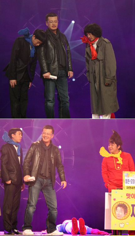 연기자 정찬이 SBS 공개 코미디 ‘웃음을 찾는 사람들’(이하 웃찾사)에 깜짝 등장해 코믹 연기를 펼쳤다. 정찬은 오는 16일 방송되는 '웃찾사'의 '절묘한 타이밍' 코너에 큰 형님 역으로 출연해 그동안 쉽게 볼 수 없었던 코믹연기를 선보였다. '절묘한 타이밍'은 절묘한 순간에 소리로 뭐든지 할 수 있는 개그맨 이재형이 악당으로 출연중인 개그맨 한현민, 정진욱 등을 혼내주는 콘셉트의 코너. 개그맨 이재형과의 친분으로 지난 9일 '웃찾사' 녹화에 출연한 정찬은 매일 당하기만 하는 악당들의 큰 회장님으로 등장, 기존의 정극 드라마에서 보여줬던 연기와 달리 감칠맛 나는 코믹연기로 관객들의 웃음을 자아냈다. yu@osen.co.kr SBS 제공.