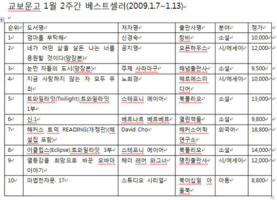 신경숙의 ‘엄마를 부탁해’가 교보문고 집계 1월 둘째 주 ‘베스트셀러’ 1위에 올랐다. ‘엄마를 부탁해’는 2주 연속 1위라는 기염을 토했다. ‘엄마를 부탁해’는 지구촌 경제 위기 속에서 가장 감성적인 단어 ‘엄마’가 화두로 떠오르면서 폭발적인 인기를 누리고 있다. 10년 전 IMF 구제금융 시절, ‘아버지’라는 화두가 서점가를 강타했던 것과 비견할 만하다고 출판 관계자들은 분석하고 있다. 교보문고 베스트셀러 담당자는 “독자들의 입소문 효과와 겨울 방학 시즌을 맞아 문학 분야에 대한 관심이 높아지고 있다. 때문에 ‘엄마를 부탁해’는 상당기간 종합 1위를 유지할 것으로 보인다”고 예상했다. 구매 독자의 73.2%가 여성이라는 점도 눈에 띈다. 소설 구매층에 여성 독자가 많은 점은 새로울 게 없지만 압도적인 비율이 눈길을 끈다. 게다가 50대에는 여성보다 남성 독자가 더 많다는 점도 시사하는 바가 크다. 경제 위기를 정면에서 체감하고 있는 중년 독자들이 감성 소설에서 위안을 찾고 있는 것으로 분석된다. 세계적인 경제 위기에 좀더 근본적으로 접근하고자 하는 노력들도 베스트셀러 집계에서 드러나고 있다. ‘자원전쟁’ ‘전쟁의 탄생’ ‘언씽커블’ 같은 자원고갈과 국제정세를 다룬 책들도 독자들의 관심을 받고 있다. 100c@osen.co.kr