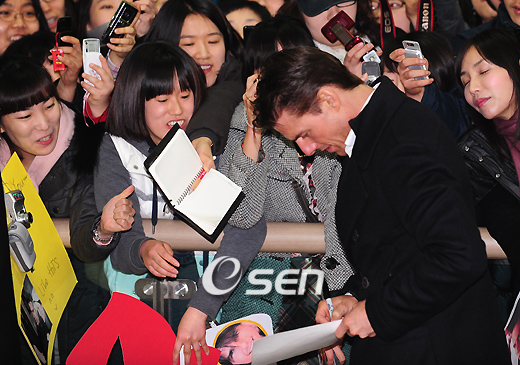 할리우드 톱 스타 톰 크루즈(46)가 16일 전세기를 타고 김포공항으로 낮 12시경 입국했다. 톰 크루즈는 영화 ‘작전명 발키리’의 개봉을 앞두고 영화 홍보차 방한했다. 톰 크루즈는 17일에는 서울 용산 CGV에서 브라이언 싱어 감독과 함께 핸드프린트 행사에 참석한다. 18일에는 그랜드 하얏트호텔에서 내한 기자회견을 갖은 이후에 삼성동 코엑스 메가박스에서 레드카펫 행사를 가지며 바쁜 홍보 일정을 소화할 예정이다. 톰 크루즈는 1월 22일 국내 개봉을 확정 지은 영화 ‘작전명 발키리’의 주연을 맡았다. 이 영화는 2차 세계대전 당시 히틀러 암살 계획을 주도했던 이들의 실화를 바탕으로 탄생한 액션 스릴러 물이다. 톰 크루즈는 조국을 위해 버렸던 양심을 되찾고 역사의 흐름을 되돌리기 위해 죽음도 두려워하지 않는 독일 장교 슈타펜버그 대령 역을 맡았다. 톰 크루즈가 팬들에게 사인을 해주고 있다./김포공항=손용호 기자spjj@osen.co.kr