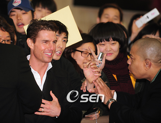 할리우드 톱 스타 톰 크루즈(46)가 16일 전세기를 타고 김포공항으로 낮 12시경 입국했다. 톰 크루즈는 영화 ‘작전명 발키리’의 개봉을 앞두고 영화 홍보차 방한했다. 톰 크루즈는 17일에는 서울 용산 CGV에서 브라이언 싱어 감독과 함께 핸드프린트 행사에 참석한다. 18일에는 그랜드 하얏트호텔에서 내한 기자회견을 갖은 이후에 삼성동 코엑스 메가박스에서 레드카펫 행사를 가지며 바쁜 홍보 일정을 소화할 예정이다. 톰 크루즈는 1월 22일 국내 개봉을 확정 지은 영화 ‘작전명 발키리’의 주연을 맡았다. 이 영화는 2차 세계대전 당시 히틀러 암살 계획을 주도했던 이들의 실화를 바탕으로 탄생한 액션 스릴러 물이다. 톰 크루즈는 조국을 위해 버렸던 양심을 되찾고 역사의 흐름을 되돌리기 위해 죽음도 두려워하지 않는 독일 장교 슈타펜버그 대령 역을 맡았다. 톰 크루즈가 밝은 모습으로 팬들과 기념사진을 찍는 가운데 경호원이 팬들을 저지하고 있다./김포공항=손용호 기자spjj@osen.co.kr