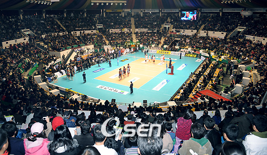 '반갑다. 프로배구 올스타전!'. 2년만에 열린 프로배구 올스타전이 만원관중으로 식지 않은 뜨거운 인기를 과시했다. 18일 서울 장충체육관에서 열린 NH농협 2008-2009 V리그 올스타전에서 4200명의 배구팬들이 관중석을 가득메우며 만원을 기록했다. 배구팬들은 지난해 2008 베이징 올림픽 예선경기 일정으로 개최되지 않았던 올스타전의 아쉬움을 만원 관중으로 배구 사랑을 보여줬다. V리그 올스타전 만원은 이번이 처음. 예매분인 3700장은 진작에 매진됐고, 현장 판매분인 500장도 오전 11시 매표이후 한 시간도 안 돼 동이났다. KOVO 관계자는 "아쉽다. 장소 섭외가 안 돼 장충체육관에서 올스타전을 개최하게 됐다. 앞으로도 배구의 지속적인 사랑을 부탁드린다"고 말했다. scrapper@osen.co.kr 장충체=윤민호 기자 ymh@osen.co.kr .