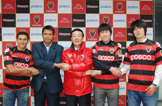 포항 스틸러스가 고른 영입을 통해 전력 강화에 성공했다. 포항은 28일 측면 공격수 브라질리아(32)와 베테랑 미드필더 김태수(28) 그리고 장신 수비수 조홍규(26)를 영입했다고 발표했다. 이에 따라 포항은 아시아축구연맹(AFC) 챔피언스리그 재도전을 앞두고 전력 강화에 성공하게 됐다. 지난해 중반부터 포항은 김형일과 박희철 등을 영입하며 자유계약선수(FA), 해외 진출, 상무 입대 등으로 전력 누수가 우려되었던 포지션 강화를 추진해왔다. 특히 브라질리아의 영입으로 포항은 약점으로 지적되던 공격수 부족을 해소할 수 있을 것으로 보인다. 그동안 세르지오 파리아스 감독은 데닐손 외에는 전방의 공격을 풀어줄 선수가 없는 한계를 체감하며 최효진의 변칙 기용을 시도해왔으나 지난 2007년 대전에서 데닐손과 환상의 호흡을 보였던 브라질리아의 영입으로 이런 문제점을 털어낼 수 있게 됐다. 또한 김태수의 가세도 눈에 띈다. 거칠고 집요한 대인 마크로 상대팀의 해결사를 묶는 데 능숙한 김태수는 또 다른 스타일을 심어줄 것으로 보인다. 신형민, 황지수, 김기동, 황전성으로 이어지는 미드필드 라인의 굳건한 살림꾼으로 기대 받고 있다. 장신 수비수 조홍규의 영입도 큰 힘이 될 것으로 보인다. 지난 2006년 대구에 입단한 조홍규는 그동안 무릎 부상으로 제 기량을 보여주지 못했으나 수비수들의 공백으로 고전이 예상됐던 포항의 수비진에 큰 힘을 실어줄 것으로 예측되고 있다. 브라질리아와 김태수, 조홍규는 이날 입단식을 가지고 포항의 훈련에 합류했다. stylelomo@osen.co.kr 포항 스틸러스 제공.