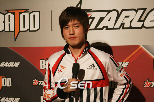 스타리그 와일드카드의 주인공은 '혁명가' 김택용(21, SK텔레콤)이었다. 김택용은 손찬웅의 불참으로 생긴 스타리그 16강 와일드카드 결정전서 박성균 이재호 등 쟁쟁한 테란의 강자들을 제압하고 스타리그 16강행 티켓을 거머쥐었다. 김택용은 28일 서울 용산 e스포츠 상설경기장에서 열린 '스타리그 36강' 와일드카드전 3강 풀리그 경기서 놀라운 테란전 능력을 선보이며 박성균과 이재호를 연파하고 스타리그 16강에 마지막 합류에 성공했다. 김택용의 첫 상대는 '독사' 박성균. 박성균은 빠른 테크트리를 최대한 이용하는 전략적인 플레이로 이재호를 꺾고 김택용의 상대가 됐다. 첫 경기의 승리로 기세를 탄 박성균은 뱃심 두둑하게 노배럭 더블 커맨드를 선택했다. 그러나 운이 좋지 못했다. 상대의 체제를 파악한 김택용은 곧바로 아둔을 올리며 다크템플러로 경기의 가닥을 잡았다. 이 선택은 기막히게 들어맞았다. 뒤늦게 김택용의 의도를 알아챈 박성균이 터렛을 건설해 위기를 모면하러했지만 다크템플러의 칼날은 이를 허용치 않았다. 김택용의 다음 상대는 이재호. 김택용은 대담하게 노게이트 더블 넥서스로 출발했다. 투 팩토리 전략을 선택한 이재호는 김택용의 정면을 무너뜨리려 했지만 김택용은 뛰어난 방어력으로 이재호의 의도를 봉쇄했다. 이재호는 자신의 필살 러시가 실패하자 항복을 선언하며 와일드카드의 주인공은 김택용으로 결정됐다. ◆ 스타리그 36강 와일드카드전 3강 풀리그. 1경기 박성균(테란, 6시) 승 이재호(테란, 2시). 2경기 박성균(테란, 7시) 김택용(프로토스, 11시) 승. 3경기 이재호(테란, 6시) 김택용(프로토스, 3시) 승. scrapper@osen.co.kr. . . . . . . .