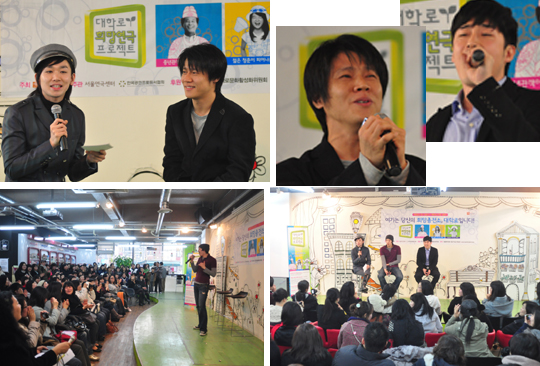 ‘대학로 희망 프로젝트’의 관객과의 만남, ‘대학로 사랑방’ 젊음의 열정이 느껴지는 공연의 메카 대학로에서 관객과 연극인이 함께하는 다양한 만남을 준비했다. ‘관객과의 대화’ ‘팬사인회’ ‘연출가와의 만남’ 등 ‘대학로 희망 프로젝트’의 프로그램들이 관객과 만남을 시도한다. 대학로가 직접 찾아가는 관객과의 만남은 공연작품에 대한 관객과 연극인이 의견을 나누고 평소 만나보기 힘든 배우들과 가까워질 수 있는 시간을 갖기도 하며, 공연 전 미리 공연을 관람할 수 있는 쇼케이스로 활용되고 있다. ‘대학로 희망 프로젝트’는 연극인과 관객이 만나는 자리이자, 다양한 공연을 한 자리에서 만나 볼 수 있는 ‘대학로 사랑방’을 선보인다. 이 프로그램은 새해맞이 희망주간 프로그램의 일환으로 1월 31일, 2월 14일 두 차례에 걸쳐 대학로에 있는 서울연극센터에서 진행된다. ‘연극인 초대석’과 ‘연극을 들려주다’뮤지컬 하이라이트, 스타배우 팬 미팅 등 다양한 프로그램이 진행될 예정이다. 31일 열리는 ‘대학로 사랑방Ⅰ’은 ‘드라마틱 사랑방’이라는 컨셉으로, 대학로에서 꾸준한 사랑을 받고 있는 배우 서현철과 2008년 대한민국연극대상 신인연기상을 거머쥔 대학로 신예스타 전미도가 연극인 초대석에 출연해 재미난 대학로이야기를 풀어내고, 연극 ‘아일랜드’를 통해 첫 연극무대에 도전하는 인기스타 조정석, 양준모를 초대해 연극의 제작과정부터 공연에 이르기까지 무대 뒤 생생한 이야기를 들어보는 팬미팅이 펼쳐진다. 이어 2월 14일 밸런타인데이에 진행되는 ‘대학로 사랑방Ⅱ’에는 연인들을 위한 ‘로맨틱사랑방’이 관객들을 기다린다. 연극인 초대석으로 배우 오달수가 출연하여, 그만의 독특한 연극이야기를 들어보고, 뮤지컬 ‘지킬 앤 하이드’의 히로인 김소현이 사랑하는 연인들을 위한 사랑의 세레나데를 들려준다. 이 외에도 연극 ‘보고싶습니다’ 뮤지컬 ‘김종욱찾기’ 출연진이 관객들의 로맨틱한 하루를 책임진다. 특히 이 날은 사랑하는 연인에게 공개 프로포즈를 할 수 있는 특별한 이벤트도 함께 제공된다. ‘대학로 희망연극 프로젝트’는 서울문화재단이 주최하고 서울연극센터와 한국공연프로듀서협회가 공동주관하며, 서울시와 대학로문화활성화위원회(한국연극협회,한국소극장협회,서울연극협회, 한국공연프로듀서협회)가 후원한다. 대학로와 공공기관이 한 마음으로 대학로 활성화를 위해 뜻을 모아 시작된 이번 프로젝트는 연극으로 희망을 전하는 다양한 행사를 마련하고, 현재 100가족을 초청하여 공연 나들이를 지원하는 ‘100가족, 100가지 대학로 이야기’캠페인도 진행 중이다. 1월 30일부터 한 달간 대학로를 사랑하는 희망도우미 스타배우들이 참여한 ‘나의 사랑, 나의 대학로’ 사진전이 열려 대학로에 얽힌 추억의 장소와 함께 갖가지 사연들이 공개된다. 전시에는 홍보대사 김갑수, 장영남 외에도 이순재, 정보석, 조재현, 유오성, 박철민, 오달수, 황정민(女)이 함께한다. 누구나 입장가능하다. (문의: www.daehangno.or.kr 02-743-9333) jin@osen.co.kr '대학로희망프로젝트'의 '미니콘서트' 행사.