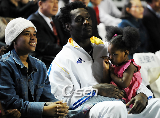 프로농구 별들의 잔치인 희망 2009 동부 프로미 올스타전이 1일 잠실학생체육관에서 벌어졌다. 전창진 감독이 이끄는 드림팀은 동부, 모비스, LG, 오리온스, KTF, 안준호 감독의 매직팀은 삼성, SK, 전자랜드, KCC, KT&G로 구성돼 멋진 경기를 펼쳤다. 경기 전 딸을 안은 삼성 레더가 아내와 함께 이벤트를 지켜보고 있다./잠실학생체=민경훈 기자rumi@osen.co.kr