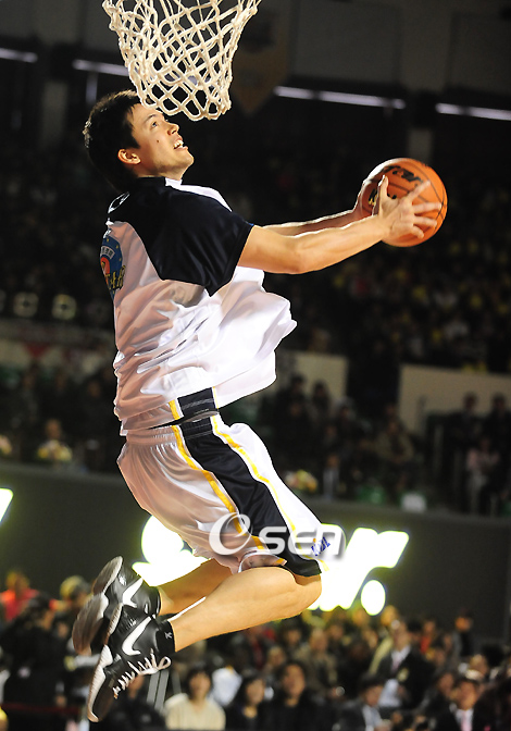 프로농구 별들의 잔치인 희망 2009 동부 프로미 올스타전이 1일 잠실학생체육관에서 벌어졌다. 전창진 감독이 이끄는 드림팀은 동부, 모비스, LG, 오리온스, KTF, 안준호 감독의 매직팀은 삼성, SK, 전자랜드, KCC, KT&G로 구성돼 멋진 경기를 펼쳤다. 경기 전 벌어진 덩크슛 콘테스트에서 오리온스 이동준이 호쾌한 백핸드 덩크를 선보이고 있다./잠실학생체=손용호 기자spjj@osen.co.kr