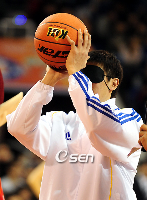 프로농구 별들의 잔치인 희망 2009 동부 프로미 올스타전이 1일 잠실학생체육관에서 벌어졌다. 전창진 감독이 이끄는 드림팀은 동부, 모비스, LG, 오리온스, KTF, 안준호 감독의 매직팀은 삼성, SK, 전자랜드, KCC, KT&G로 구성돼 멋진 경기를 펼쳤다. 이상민이 '아빠의 도전' 게임에 나와 눈을 안대로 가리고 슛을 하고 있다./잠실학생체=손용호 기자spjj@osen.co.kr