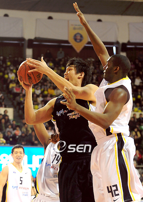 프로농구 별들의 잔치인 희망 2009 동부 프로미 올스타전이 1일 잠실학생체육관에서 벌어졌다. 전창진 감독이 이끄는 드림팀은 동부, 모비스, LG, 오리온스, KTF, 안준호 감독의 매직팀은 삼성, SK, 전자랜드, KCC, KT&G로 구성돼 멋진 경기를 펼쳤다. 1쿼터 매직팀 하승진이 드림팀 두 용병 사이에서 골밑슛을 노리고 있다./잠실학생체=손용호 기자spjj@osen.co.kr