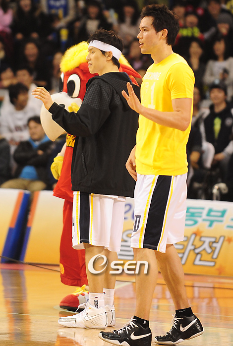 프로농구 별들의 잔치인 희망 2009 동부 프로미 올스타전이 1일 잠실학생체육관에서 벌어졌다. 전창진 감독이 이끄는 드림팀은 동부, 모비스, LG, 오리온스, KTF, 안준호 감독의 매직팀은 삼성, SK, 전자랜드, KCC, KT&G로 구성돼 멋진 경기를 펼쳤다. 작전타임때 이동준 김효범이 소녀시대의 GEE에 맞춰 춤을 추고 있다./잠실학생체=손용호 기자spjj@osen.co.kr
