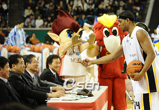 프로농구 별들의 잔치인 희망 2009 동부 프로미 올스타전이 1일 잠실학생체육관에서 벌어졌다. 전창진 감독이 이끄는 드림팀은 동부, 모비스, LG, 오리온스, KTF, 안준호 감독의 매직팀은 삼성, SK, 전자랜드, KCC, KT&G로 구성돼 멋진 경기를 펼쳤다. 하프타임 때 벌어진 덩크슛 콘테스트 결승에서 화이트가 점수가 마음에 들지 않자 심사위원석에 가서 농담으로 어필하고 있다./잠실학생체=민경훈 기자rumi@osen.co.kr