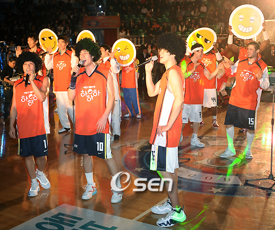프로농구 별들의 잔치인 희망 2009 동부 프로미 올스타전이 1일 잠실학생체육관에서 벌어졌다. 전창진 감독이 이끄는 드림팀은 동부, 모비스, LG, 오리온스, KTF, 안준호 감독의 매직팀은 삼성, SK, 전자랜드, KCC, KT&G로 구성돼 경기를 펼쳐 드림팀이 138-127로 승리를 거두었다. 경기를 마치고 선수들이 다 함께 노래를 합창하고 있다./잠실학생체=민경훈 기자rumi@osen.co.kr