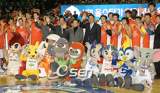 프로농구 별들의 잔치인 희망 2009 동부 프로미 올스타전이 1일 잠실학생체육관에서 벌어졌다. 전창진 감독이 이끄는 드림팀은 동부, 모비스, LG, 오리온스, KTF, 안준호 감독의 매직팀은 삼성, SK, 전자랜드, KCC, KT&G로 구성돼 경기를 펼쳐 드림팀이 138-127로 승리를 거두었다. 경기를 마치고 선수들과 감독 및 관계자들이 포토타임을 갖고 손을 흔들고 있다./잠실학생체=민경훈 기자rumi@osen.co.kr
