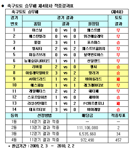 [축구토토] 이변이 속출한 지난 주말 열린 축구토토 승무패 4회차서 1등 적중자가 나오지 않아 적중상금이 다음회차로 이월됐다. 스포츠토토㈜(www.sportstoto.co.kr)는 지난 주말 벌어진 잉글랜드 프리미어리그 7경기, 스페인 프리메라리가 7경기 등 유럽 프로축구 14경기를 대상으로 시행한 축구토토 승무패 4회차에서 14경기 결과를 모두 정확히 맞힌 1등 적중자가 한명도 나오지 않아 적중상금이 이어지는 5회차로 이월됐다고 밝혔다. 이번 회차에선 13경기 결과를 맞힌 2등 적중자만 2명 나와 각각 1억 1,110만6,080원씩을 적중 상금으로 받아가게 됐다. 3등(12경기 적중) 34명에게는 653만 5,660원씩 돌아가며 4등(11경기 적중) 457명에게는 97만 2,490원씩 지급된다. 이번 회차에선 잉글랜드 프리미어리그의 강팀 아스널과 상위권을 달리고 있는 애스턴빌라가 홈에서 각각 약체 웨스트햄과 위건을 상대로 무승부를 기록하는 이변이 발생해 축구팬들에게 큰 충격을 안겨줬다. 그리고 스페인 프리메라리가에서도 7위 AT마드리드가 11위 바야돌리드에게 패하는 등 예상외의 이변이 속출한 결과 1등 적중자가 나오지 않게 됐다. 한편 이어지는 축구토토 승무패 5회차는 7일(토)부터 9일(월) 새벽까지 벌어지는 유럽 프로축구 14경기를 대상으로 시행되며 발매 마감은 정확한 일정이 확정되는 대로 스포츠토토 홈페이지 등을 통해 공지할 예정이다.