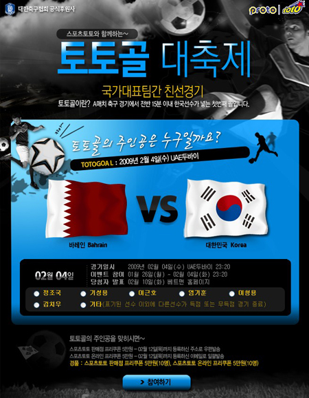 [축구토토] 축구 국가대표팀의 2009년 두번째 친선경기의 첫 골은 이근호가 쏜다? 체육진흥투표권 수탁사업자인 스포츠토토(www.sportstoto.co.kr)가 한국과 바레인의 축구국가대표 친선경기를 대상으로 한국선수 가운데 전반 15분 이내 첫 번째로 골을 기록하는 선수를 알아 맞히는 '토토골 대축제' 이벤트에 많은 축구팬들의 뜨거운 관심이 쏠리고 있다. 각 선수별 투표율을 살펴보면 전체 참가자 4796명(3일 오전 기준) 중 37.5%(1800명)가 이근호의 첫 골을 예상해 많은 축구팬들은 지난 시즌 K리그에서 국내 선수 중 가장 많은 골을 기록한 이근호의 활약을 기대하고 있는 것으로 나타났다. 이근호는 박지성과 박주영, 그리고 이영표 등 해외파 선수들이 없는 가운데 허정무 호의 공격첨병 역할을 하고 있다. 비록 지난 시리아와 경기서 대표팀이 1-1로 무승부를 거두었지만 이날 경기서도 종횡무진 상대진영을 파고들며 많은 기회를 얻었던 것. 뒤를 이어 기타 선수 34.8%(1672명), 기성용 10.4%(501명), 염기훈 6.9%(332명), 이청용 5.8%(279명), 서동현 2.9%(143명), 김정우 1.3%(67명)등의 비율로 토토골의 주인공을 예상했다. 이번 ‘토토골 대축제’ 이벤트는 4일(수) 오후 11시 20분까지 스포츠토토 홈페이지(www.sportstoto.co.kr)나 스포츠토토 공식 온라인 발매 사이트인 베트맨 (www.betman.co.kr)를 통해 참여할 수 있고 ‘토토골’의 주인공을 정확히 예상한 축구팬들에게는 추첨을 통해 20명에게 스포츠토토를 온/오프라인에서 즐길 수 있는 프리쿠폰을 지급한다. 토토골 대축제 이벤트 화면