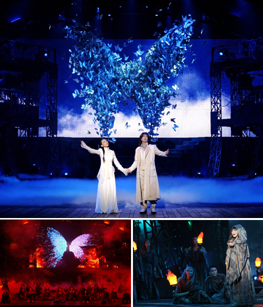 중국 최초의 대형 창작 뮤지컬‘디에(蝶)-버터플라이즈(나비)’가 2009년 3월 21일부터 29일까지 세종문화회관 대극장에서 공연된다. 중국판 ‘로미오와 줄리엣’으로 불리는 고전 ‘양산백과 축영대’의 이야기를 모티브로 3년여의 준비 기간을 거쳐 80억 원 이상의 제작비가 투입된 작품이다. 중국, 캐나다, 영국 등 다국적 스태프를 영입해 세계적인 제작진이 완성한 중국의 블록버스터급 창작뮤지컬이다. 국내에는 지난해 7월 제 2회 대구국제뮤지컬페스티벌(DIMF) 폐막작으로 공식 초청돼 개막 전 이미 티켓이 절반 이상 판매될 정도로 뜨거운 관심을 모은 작품이다. 게다가 국내 흥행에도 성공한 바 있는 뮤지컬 ‘노트르담 드 파리’ ‘돈 주앙’ ‘태양의 서커스’의 연출자인 질 마으와 조명 디자이너 알랭 로르띠 등의 세계 최정상의 창작 팀이 참여해 창작 단계부터 관심을 모았다. 중국 최고의 뮤지컬 프로덕션이 함께 탄생시킨 이번 작품은 슬프고도 아름다운 사랑 이야기를 보여준다. 100년 음악전통의 하얼빈교향악단 70여명 규모의 대형 오케스트라가 참여하는 이번 공연은 생동감 있는 음악구성과 환상적인 연출, 교향악과 일렉트릭이 조화를 이루는 감동을 기대케 한다. jin@osen.co.kr 뮤지컬 ‘디에-버터플라이즈’.
