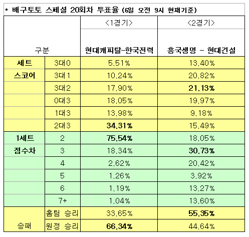 [배구토토] 국내 배구팬들은 2008~2009프로배구 흥국생명-현대건설전에서 홈팀 흥국생명의 우세를 점쳤다. 스포츠토토 공식 온라인 발매사이트인 베트맨(www.betman.co.kr)은 오는 7일(토) 치러지는 2008~2009 프로배구 현대캐피탈-한국전력(KEPCO45), 흥국생명-현대건설전 등 2경기를 대상으로 한 배구토토 스페셜 20회차 게임 투표율 중간집계 결과 2경기 흥국생명-현대건설전에서 홈팀 흥국생명의 승리에 55.35%%가 투표해 다수의 배구팬들이 흥국생명의 승리를 예상한 것으로 나타났다고 밝혔다. 배구토토 스페셜은 게임은 더블(2경기 대상) 및 트리플(3경기 대상) 등 두 가지 방식으로 진행되며 각 경기의 최종세트스코어와 1세트 점수차를 예상하면 된다. 최종세트스코어는 3:0, 3:1, 3:2, 0:3, 1:3, 2:3 등 6개 항목으로 구성되며 1세트 점수차 표기방식은 2점차, 3점차, 4점차, 5점차, 6점차, 7점차 이상 등 6가지로 구분된다. 흥국생명-현대건설전 최종 세트스코어는 흥국생명의 3-2 승리(21.13%)와 3-1 승리(20.82%)를 예상한 참가자가 많았다. 1세트 점수차의 경우 3점차가 30.73%로 가장 많았고 4점이 20.42%로 그 뒤를 이었다. 1경기 현대캐피탈-한국전력전은 일반적인 예상을 깨고 원정팀 한국전력의 승리에 66.34%의 참가자가 투표했다. 최종 세트스코어로는 한국전력의 3-2 승리 34.31%와 3-0 승리 18.05%를 점친 참가자가 많았다. 1세트 점수차는 2점이 75.54%로 가장 많았고 3점 18.34%가 그 뒤를 이었다. 한편 이번 배구토토 스페셜 20회차 게임은 오는 7일(토) 오후 2시 50분에 발매 마감된다. '즐거운 스포츠, 즐거운 토토'(http://www.betman.co.kr)