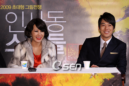 영화 '인사동 스캔들'의 현장공개 행사 및 기자회견이 6일 전라북도 부안 영상테마파크에서 열려 박희곤 감독과 주연배우 엄정화 김래원이 참석했다. 이 영화는 조선시대 화가 ‘안견’의 숨겨진 명화 ‘벽안도’를 놓고 벌이는 미술계의 복잡한 이해 관계 속에 대한민국 최고의 복원 전문가 ‘이강준’이 뛰어들면서 벌어지게 되는 꼬리에 꼬리를 무는 음모와 반전을 그려냈다. 기자회견 중 엄정화와 김래원이 환하게 미소짓고 있다./부안=민경훈 기자 rumi@osen.co.kr