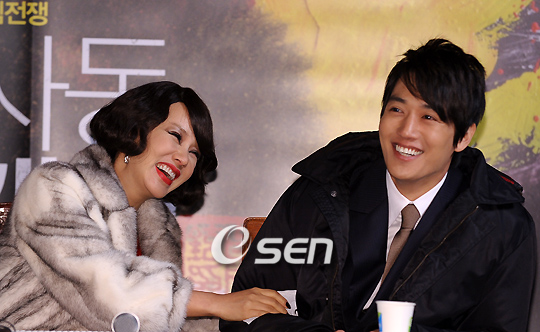 영화 '인사동 스캔들'의 현장공개 행사 및 기자회견이 6일 전라북도 부안 영상테마파크에서 열려 박희곤 감독과 주연배우 엄정화 김래원이 참석했다. 이 영화는 조선시대 화가 ‘안견’의 숨겨진 명화 ‘벽안도’를 놓고 벌이는 미술계의 복잡한 이해 관계 속에 대한민국 최고의 복원 전문가 ‘이강준’이 뛰어들면서 벌어지게 되는 꼬리에 꼬리를 무는 음모와 반전을 그려냈다. 기자회견 중 엄정화가 김래원의 팔을 붙잡고 환하게 웃고 있다./부안=민경훈 기자 rumi@osen.co.kr