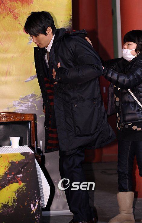 영화 '인사동 스캔들'의 현장공개 행사 및 기자회견이 6일 전라북도 부안 영상테마파크에서 열려 박희곤 감독과 주연배우 엄정화 김래원이 참석했다. 이 영화는 조선시대 화가 ‘안견’의 숨겨진 명화 ‘벽안도’를 놓고 벌이는 미술계의 복잡한 이해 관계 속에 대한민국 최고의 복원 전문가 ‘이강준’이 뛰어들면서 벌어지게 되는 꼬리에 꼬리를 무는 음모와 반전을 그려냈다. 기자회견 중 김래원이 정장위에 파카를 입고 있다./부안=민경훈 기자 rumi@osen.co.kr