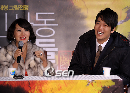 영화 '인사동 스캔들'의 현장공개 행사 및 기자회견이 6일 전라북도 부안 영상테마파크에서 열려 박희곤 감독과 주연배우 엄정화 김래원이 참석했다. 이 영화는 조선시대 화가 ‘안견’의 숨겨진 명화 ‘벽안도’를 놓고 벌이는 미술계의 복잡한 이해 관계 속에 대한민국 최고의 복원 전문가 ‘이강준’이 뛰어들면서 벌어지게 되는 꼬리에 꼬리를 무는 음모와 반전을 그려냈다. 기자회견 중 엄정화의 말에 김래원이 환하게 미소짓고 있다./부안=민경훈 기자 rumi@osen.co.kr