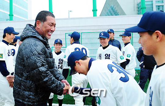 일본 프로야구의 슈퍼스타이며 한국계로 알려진 기요하라 가즈히로(42)가 한국 야구를 취재하기 위해 7일 한국을 찾았다. 2008년을 끝으로 현역에서 은퇴, 일본 지상파 민영방송인 TBS에서 월드베이스볼클래식(WBC) 평론가로 활약 중인 기요하라는 이틀간 한국에 머물면서 WBC 4강, 베이징올림픽 우승 등 최근 급성장한 한국 야구를 취재한다. 신일고 야부구를 찾은 기요하라가 선수들과 악수를 나누고 있다./윤민호 기자ymh@osen.co.kr