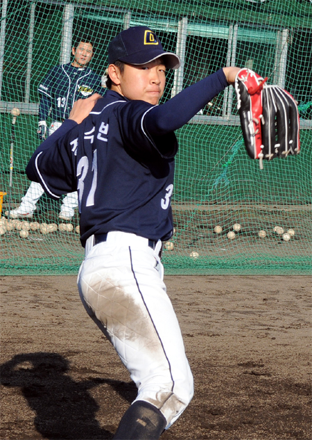 일본 미야자키에 스프링캠프를 차린 두산 베어스가 신인 외야수 정수빈(19)의 기대 이상의 모습에 흐뭇함을 감추지 못하고 있다. 10일 두산에 따르면 정수빈은 곱상한 외모와 다소 작은 체격(175cm, 70kg)을 지녔다. 그럼에도 정수빈은 센스 있는 주루플레이, 기본기가 바탕이 된 간결한 수비동작과 함께 매서운 타격 솜씨를 선보여 기존 외야수들에게 긴장감을 심어주고 있다. 올 시즌 2차 5순위로 계약금 6000만 원을 받고 두산 유니폼을 입은 정수빈은 수원 유신고를 졸업한 좌투좌타 외야수. 고교시절 투수로 활약한 강한 어깨와 함께 센스 있는 타격과 안정적인 외야 수비를 연일 선보이고 있어 주변의 기대감이 더 커지고 있는 상황이다. 김광수 수석코치도 "고졸 신인 외야수임에도 불구하고 타격 감각도 좋고 타구 처리를 침착하게 해낸다"며 "주루플레이도 수준급이기 때문에 당장은 힘들더라도 3년 안에 두산 외야의 한 축이 될 수 있는 선수다. 기존 외야수들이 긴장 좀 해야 할 것 같다"고 정수빈을 평가했다. 성영훈, 유희관과 함께 3명만 참가한 두산 신인 중 한 명인 정수빈이 스프링캠프를 통해 존재감을 알리기 시작했다. letmeout@osen.co.kr 정수빈-두산 베어스 제공.