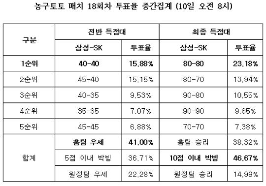 [농구토토] 국내 프로농구 팬들은 오는 11일 벌어지는 서울 삼성-서울 SK전에서 양팀의 치열한 접전을 점치고 있는 것으로 나타났다. 스포츠토토 공식 온라인 발매사이트인 베트맨(www.betman.co.kr)이 오는 11일 오후 7시 잠실실내체육관에서 열리는 2008~2009 프로농구 삼성-SK전을 대상으로 한 농구토토 매치 18회차 투표율 중간집계 결과 전체 참가자의 46.67%가 양팀의 10점차 이내 박빙승부를 전망했다고 밝혔다. 홈팀 삼성의 승리를 예상한 참가자가 38.32%로 뒤를 이었고, 원정팀 SK의 승리를 예상한 참가자는 14.99%로 집계됐다. 최종 득점대에서는 양팀이 모두 80점대 기록해 10점차 이내에서 승부가 갈릴 것이라는 예상이 23.18%로 최다를 차지했다. 전반전 리드 예상에서는 홈팀 삼성의 리드 예상이 41.00%로 집계돼 SK(22.28%)에 비해 다소 높게 나타났다. 전반전 득점대의 경우에는 40-40점대로 양팀의 5점차 이내 접전이 15.88%로 가장 높게 집계됐다. 스포츠토토 관계자는 "국내 농구팬들은 서울 라이벌인 삼성과 SK가 같은 점수대를 기록하며 치열한 접전을 펼칠 것으로 전망했다"며 "올 시즌 상대전적에서 삼성이 1승3패로 우위를 보이고 있지만 1점차 박빙승부가 두 차례나 나온 만큼 신중한 예측이 요구된다"고 말했다. 한편 이번 농구토토 매치 18회차 게임은 경기시작 10분 전인 오는 11일 오후 6시 50분에 발매 마감된다. http://www.betman.co.kr">'즐거운 스포츠, 즐거운 토토'(http://www.betman.co.kr)
