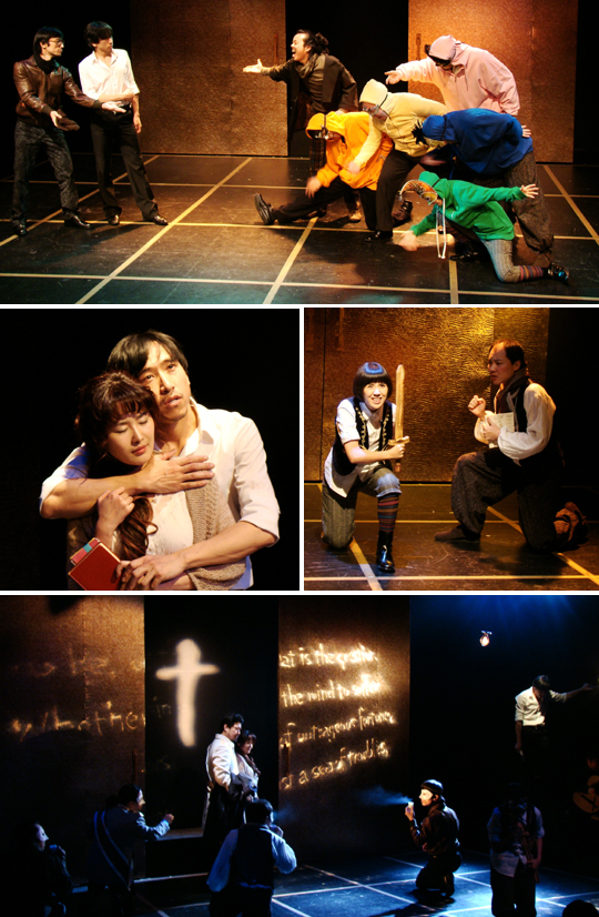 [리뷰]‘햄릿-슬픈 광대의 이야기’ ‘햄릿’, 너무 유명해서 어려운 이름이다. 셰익스피어 원작의 고전이면서 이미 상식이 되어버린 작품이다. 원작을 살린 정통 ‘햄릿’이든, 새롭게 해석된 ‘햄릿’이든, 셰익스피어의 거대 원작이 가진 힘은 장르를 막론하고 오랜 시간 유전자처럼 관객들의 가슴 속에 흐르고 있다. 셰익스피어의 ‘햄릿’은 작품 안에 너무도 많은 생각이 담겨있다. 관객은 정극 ‘햄릿’의 작품에 담긴 많은 생각들을 캐릭터에 맞춰 보고, 다양한 해석들을 쏟아낸다. ‘햄릿’이라는 캐릭터는 차갑고 날카로운 인물이기도 하지만 부드럽고 로맨틱한 면모도 갖췄고 때로는 혼돈에 가득 찬 혼란스런 인물로 묘사되기도 한다. 무대가 어떻게 전개되든 ‘햄릿’이 가지고 있는 캐릭터는 셰익스피어의 기본 스토리에 연출자가 의도하는 색깔에 따라 카멜레온처럼 다양하게 변신한다. ‘햄릿-슬픈 광대의 이야기’는 셰익스피어의 원작에 어릿광대 요릭을 등장시켜 어른 ‘햄릿’과 어린 ‘햄릿’의 이야기를 중첩시켰다. 제목에서 알 수 있듯 이 작품은 기존 ‘햄릿’과 달리‘광대’의 등장으로 새롭게 스토리를 구성했다. 원작 속 ‘햄릿’은 죽은 아버지의 끔찍한 사건을 확인하려 ‘곤자고의 암살’ 연극을 무대에 올린다. ‘햄릿-슬픈 광대의 이야기’는 이러한 원작의 내용을 어른 ‘햄릿’을 통해 무대 위에 펼쳐놓는다. 삼촌 클로디어스 왕을 조카가 독살하고 왕위와 부인까지 차지한다는 내용의 연극은 삼촌 클로디어스 왕을 기겁하게 한다. 자신이 왕위를 차지하기 위해 취한 만행과 너무도 닮았기 때문이다. ‘햄릿’의 원작과 다를 바 없는 어른 ‘햄릿’의 이야기는 어린 ‘햄릿’의 이야기와 겹쳐져 액자식 구성으로 전개된다. 이 작품은 어린 ‘햄릿’이 광대 요릭에게 연극을 배우며 ‘곤자고의 암살’을 연기한다는 것을 추가했다. 어릴 때 요릭에게 배웠던 비극적인 연기는 어른 ‘햄릿’이 되면서 실제 삶이 투영 돼 비극을 더했던 것이다. 비극 연기에 힘겨워하는 어린 ‘햄릿’은 광대 요릭의 진실어린 가르침으로 자신의 비극적인 인생에 가까워진다. 이 연극은 광대 요릭을 통해 정극 ‘햄릿’에 새로운 형식을 시도했다. 관객들은 ‘슬픈 광대의 이야기’라는 부제에 광대의 비중이 클 것이라고 기대했다. 하지만 이 작품에서 '광대'가 의미하는 캐릭터적인 색깔은 없었다. 게다가 등장하는 비중도 생각만큼 크지 않다. 일반적으로 '광대'는 연극무대에서 커다란 의미를 전달하기 마련이다. 시대를 풍자하거나 비판하는 데에 광대만한 탁월한 요소는 없다. 이런 의미에서 이 작품에 ‘광대’라는 단어가 부제로 달리기에 과연 적합했는지 질문을 던질 만하다. 부제와는 달리 정극 ‘햄릿’과 다를 바 없었던 이번 공연은 어색한 설정으로 인한 부자연스러움이 많이 드러냈다. “비극배우가 되겠다”던 어린 ‘햄릿’은 공연을 마치고 “유쾌한 희극만 하겠다”며 광대 요릭의 등에 업혀 울먹인다. 이 장면에서 어린 ‘햄릿’의 비극적인 인생과 중첩돼 가슴이 뭉클해야 하는 것인데 관객들은 그렇지 못하다. 메시지를 담지 못한 ‘광대’의 존재감 없는 설정과 정극 ‘햄릿’의 캐릭터를 소화하지 못한 이번 무대에서 어린 ‘햄릿’의 비극적인 결말은 소통하기가 쉽지 않았다. jin@osen.co.kr 연극‘햄릿-슬픈 광대의 이야기’.