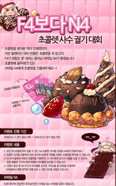 [게임무빙닷컴] 드라마에 F4가 있다면 ‘라테일’에는 원조 꽃미남 N4가 있다? ㈜액토즈소프트(사장 김강)의 글로벌 인기 게임 ‘라테일(www.latale.com)에서 발렌타이데이를 맞아 11일부터 25일까지 이벤트를 진행한다. 이벤트는 ‘라테일’ 꽃미남 NPC ‘N4’에게 초콜렛 아이템으로 사랑고백을 하고, 푸짐한 선물을 받는 이벤트. 라테일’ 핑크빛 담요와 게임 속 깜찍한 캐릭터가 새겨진 교통카드 등 푸짐한 상품까지 준비했다. 유저들은 몬스터 사냥을 통해 ‘초콜렛 상자’ 아이템을 얻게 되는데 이를 꽃미남 NPC ‘N4’에게 가져가면, 꽃미남 ‘N4’는 깜짝 선물로 답변해 준다. 이 외에도 이벤트 기간 동안, N4가 제안한 ‘퀘스트 수행하기’ 등을 수행하면 이동 속도 및 옵션 확률 증가 등의 혜택을 주는 특별 타이틀을 습득할 수 있다. 타이틀을 획득한 유저들 중 추첨을 통해 50명에게 무릎담요와 교통카드 등을 선물할 계획이다. ‘라테일’ PM 안홍수 과장은 “발렌타인데이의 달콤하고 사랑스런 분위기가 ‘라테일’ 세상까지 전해지길 바라는 마음으로 이번 이벤트를 기획했다.”며 “원조 꽃미남 N4와 함께하는 이번 이벤트로 행복한 발렌타인데이를 보내길 바란다.”고 말했다. ‘라테일’의 발렌타인데이 기념 이벤트는 ‘라테일’ 공식 홈페이지(www.latale.com)에서 직접 만나 볼 수 있다. / 영상으로 만나는 게임 세상 - 게임무빙닷컴
