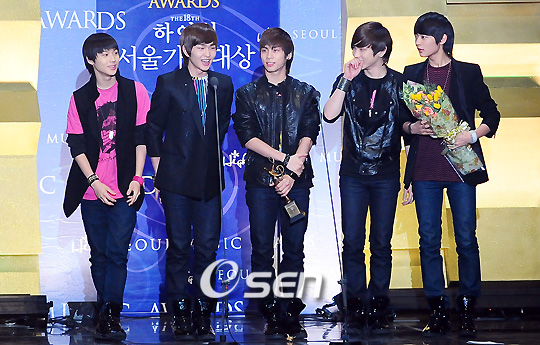 제 18회 하이원 서울가요대상이 12일 오후 강원도 태백시 고원체육관에서 열렸다. 신인상을 수상한 샤이니가 수상 소감을 전하고 있다. 스포츠서울이 주최하고, 서울가요대상 조직위원회가 주관하는 제 18회 하이원 서울가요대상은 지난 한해 최고의 인기를 누린 최고 가수상인 대상을 비롯해 본상(10팀), 신인상(3팀), 성인가요상(1팀), 모바일 인기상(1팀), 한류상(1팀), 디지털음원상(1팀), 최고앨범상(1팀), 하이원뮤직상(1팀), 공연문화상(1팀), YTN스타상(1팀) 등 총 22팀이 수상한다./태백=윤민호 기자ymh@osen.co.kr