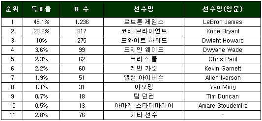 국내 농구팬들이 꼽은 2009년 올스타전 MVP의 가장 유력한 후보는 르브론 제임스(LeBron James)인 것으로 나타났다. ㈜네오위즈게임즈(대표 최관호)와 일렉트로닉 아츠(Eletronic Arts)가 공동 개발한 온라인 농구게임 ‘NBA 스트리트 온라인’이 게임 이용자 2,738명을 대상으로 2009년 NBA 올스타전 MVP’를 묻는 설문조사 결과, 응답자의 절반에 가까운 45.1%(1,236표)가 동∙서부 대표로 출전한 10명의 쟁쟁한 스타 선수들 중 르브론 제임스를 MVP감으로 꼽았다. 코비 브라이언트(Kobe Bryant)가 29.8%(817표)로 그 뒤를 이으며 유력한 후보 중 한 명으로 꼽히고 있으며, 지난 2007-08 NBA 올스타전 덩크왕 드와이트 하워드(Dwight Howard)도 최근의 상승세에 힘입어 10%(275표)를 얻었다. 반면, 올림픽에서 큰 활약을 보인 드웨인 웨이드(Dwyane Wade)은 3.6%(99표), 크리스 폴(Chris Paul)과 케빈 가넷(Kevin Garnett)은 각각 2.3% (62표)와 2.2%(60표)를 받아 MVP와는 거리가 있는 것으로 나타났다. 그 외 앨런 아이버슨(Allen Iverson) 1.9% (51표), 야오밍(Yao Ming) 1.1% (31표), 팀 던컨(Tim Duncan) 0.7% (18표), 아마레 스타더마이어(Amare Stoudemire) 0.5% (13표)였고, 기타 선수를 꼽은 의견은 2.8%(76표)였다. 이번 NBA 올스타전은 르브론 제임스, 케빈 가넷(동부)과 코비 브라이언트, 야오 밍(서부) 등 NBA 최강 선수들이 동∙서부팀으로 나뉘어 화려한 경기를 펼칠 예정으로 모든 농구팬들이 기다려온 축제의 장으로 실제 어느 선수가 MVP로 선정될지 큰 관심을 모으고 있다. 이번 투표결과에 대한 더 자세한 내용은 NBA 스트리트 온라인 홈페이지(http://nbastreetonline.co.kr)에서 확인할 수 있다. 한편, NBA 스트리 온라인은 이번 올스타전의 MVP와 올스타전 승리팀을 맞추는 이벤트도 진행 중이다. 투표에 참여만 해도 게임머니를 100% 지급하고, MVP를 맞추면 추가 게임머니를, 승리팀을 맞출 경우 추첨을 통해 2009년 올스타 공식 유니폼과 농구화 등 푸짐한 경품을 제공할 예정이다. 영상으로 만나는 게임 세상 - 게임무빙닷컴제공 OSEN 엔터테인먼트팀 osenstar@osen.co.kr