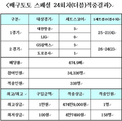 [배구토토] 국내 프로배구 V리그를 대상으로 한 배구토토 스페셜 24회차 게임에서 338명의 적중자가 나왔다. 체육진흥투표권 수탁사업자인 스포츠토토㈜(www.sportstoto.co.kr)는 지난 14일(토) 벌어진 대한항공-LIG, GS칼텍스-도로공사전 등 국내프로배구 2경기를 대상으로 시행한 배구토토 스페셜 24회차 게임에서 2경기의 최종 세트스코어 및 1세트 점수차이를 정확히 맞힌 적중자가 338명 나와 각각 베팅금액의 474.9배에 해당하는 적중상금을 받게 됐다고 밝혔다. 이번 회차에서는 플레이오프행을 거의 확정지은 대한항공이 LIG를 3-0(1세트 점수차 4점)으로 완파하고 여자부에서 GS칼텍스가 상승세를 타고 있던 도로공사를 3-1(1세트 점수차 2점)로 물리치는 등 특별한 이변은 발생하지 않았지만 여자부 최하위를 기록하고 있는 도로공사가 1세트에서 선전하며 의외의 2점차 박빙승부를 펼친 결과 배당률이 상승했다. 스포츠토토 관계자는 "국내프로배구를 대상으로 한 배구토토 스페셜 게임에서 338명의 배구팬이 2경기의 최종세트스코어와 1세트 점수차이를 정확히 맞혔다"며 "대다수의 배구팬들이 경기의 승패는 정확히 예측했으나 여자부의 도로공사가 1세트에서 의외의 선전을 펼치며 적중자수가 크게 줄어들었다"고 말했다. http://www.betman.co.kr">'즐거운 스포츠, 즐거운 토토'(http://www.betman.co.kr).