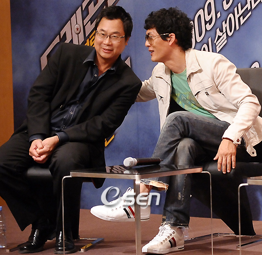 영화 '드래곤볼 에볼루션'의 공식 기자회견이 18일 오후 서울 중구 신라 호텔에서 열렸다. 이 자리에는 유명 중국 배우 주윤발(54)과 god 출신 배우 박준형(40)이 다른 '드래곤볼 에볼루션'의 주연배우들 및 제임스 왕 감독과 함께 참석했다. 오는 3월 12일 개봉예정인 영화 '드래곤볼 에볼루션' 프로모션을 위해 15년 만에 내한한 주윤발은 '무천도사' 역을 연기했고 박준형은 '야무치' 역을 맡았다. 또한 손오공 역은 영화 '우주전쟁'에서 톰 크루즈의 아들 '로비'역으로 출연했던 저스틴 채트윈이 맡았고, 영화 '투모로우' '포세이돈' '오페라의 유령' 등으로 잘 알려진 에미 로섬이 부루마 역을 연기했다. 한인 2세 배우인 제이미 정은 치치 역을 맡았고 제임스 마스터스는 피콜로 역을 연기했다. 기자회견 중 박준형이 제임스 왕 감독에게 어깨동무를 하며 말을 하고 있다./민경훈 기자 rumi@osen.co.kr