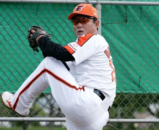 "갤러리가 많으니 구위가 최고구만". 한화 이글스의 전지 훈련이 한창인 하와이 호놀룰루에 위치한 센트럴 오아후 리지널 파크. 문동환(37. 한화 이글스)의 공을 받던 이도형(34)은 기자단의 시선이 문동환에게로 향하자 잇단 칭찬으로 투수의 기를 북돋워 주었다. 이도형의 추임새는 결코 빈말이 아니었다. 문동환은 포수 미트를 향해 묵직한 직구를 던졌고 공이 미트에 꽂히는 파찰음은 그의 구위를 실감케 할 정도로 경쾌하게 울려 퍼졌다. 투구를 지켜보던 손혁 투수 인스트럭터 또한 "조금 더 낮게 제구한다면 좋을 것 같다"라는 이야기를 덧붙였을 뿐, 릴리스 포인트 등에 대해서는 별다른 주문을 하지 않았다. 지난 시즌 스프링캠프부터 왼쪽 장딴지-고관절-종아리-허리 등 잇단 부상으로 인해 1군서 단 한 경기도 등판하지 못하며 주춤했던 문동환은 전지훈련서 부활을 위해 안간힘을 쓰고 있다. 김인식 감독 또한 "확실히 구위가 나아졌다"라며 문동환에 대한 기대감을 내비췄다. 18일(한국 시간) 한화 훈련장에서 만난 문동환은 "페이스는 괜찮다. 팔꿈치 부위 또한 아프지 않아 공을 던지는 데는 별 무리가 없다"라며 너털 웃음을 지었다. 롯데 시절부터 팔꿈치 부상과 수술, 그리고 긴 재활이라는 쉽지 않은 길을 걸었던 문동환이었기에 만 37세라는 나이와 부상 전력에 따른 움직임의 위축 여부가 궁금했다. "수술은 모두 롯데서만 했었네요. 부상이 재발할까봐 두려움을 갖고 소극적인 피칭을 하는 선수들도 있는데 제 경우는 그렇지 않습니다. 오히려 긴 재활 기간으로 인해 실전 감각이 떨어지고, 그로 인해 합류 후 제 구위를 발휘하지 못할 것 같다는 생각이 두려움을 낳았습니다" 문동환은 1995년 연세대 졸업 이후 곧바로 프로에 입단한 것이 아닌, 현대 피닉스를 거친 뒤 1997시즌 롯데에 입단했다. 피닉스 시절이 프로 입단 후 적응에 걸림돌이 되지 않았는지에 대해 묻자 그는 "좋았습니다. 덕분에 계약금도 많이 받고. 물론 몸값 인플레이션이라는 부정적인 요소가 있기는 했지만 덕분에 프로 선수들의 연봉 최저 한도도 1200만원에서 2000만원으로 올라갔지 않습니까"라며 이야기를 덧붙였다. "실업 야구가 사라지면서 프로서 방출된 선수들이나 고교, 대학 졸업 후 미지명된 선수들의 앞길이 막혀버린 것과 다름 없습니다. 야구 특기자들의 재사회화가 체계적으로 이루어진다는 전제 하에 평소에는 회사서 근무하면서 야구를 병행하는 시스템이 바람직하다고 봅니다. 야구 특기자들이 직업 야구인으로는 희박한 가능성 속에 살아가고 있는 데 실업 야구가 부활한다면 재사회화와 야구를 지속하는 두 가지 방법을 모두 꾀할 수 있지 않나 싶습니다" 문동환의 2009시즌 목표는 소박하면서도 간절했다. 부상의 질곡에서 오랫동안 허덕였던 그였기 때문인지 아프지 않은 상태에서 마운드에 설 수 있었으면 좋겠다는 이야기를 털어 놓았다. "올해는 아프지 않았으면 좋겠습니다. 지금 제가 생각하기에는 몸 상태가 80% 정도인데 이대로 페이스를 손조롭게 끌어올려 건강한 몸으로 시즌을 맞이할 수 있었으면 좋겠습니다. 지난해 2군 경기 등판 후 몸이 안 좋았던 만큼 다시는 그러한 일이 없도록 더 열심히 노력하는 게 제 목표이자 소망입니다" farinelli@osen.co.kr 한화 이글스 제공.