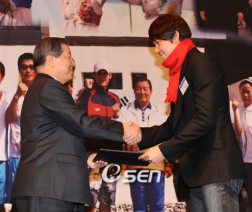 제55회 대한체육회 체육상 시상식이 19일 오전 서울 광장동 워커힐호텔에서 열렸다. 베이징올림픽에서 금메달을 획득한 야구 대표팀이 대상을 수상했고 남녀 최우수상은 경기부문에서 수영 박태환(단국대)과 역도 장미란(고양시청), 지도 부문에서는 역도의 오승우 전 국가대표 감독(현 제주특별자치도청 감독)이 받았다. 또 공로부문 최우수상은 김용우 전 대한인라인롤러연맹회장과 문병용 강원대 스포츠과학부 교수가, 심판부문은 문상희 한국중고유도연맹 심판위원장, 연구 부문은 김범식 성균관대 스포츠과학부 교수가 각각 뽑혔다. 우수상은 피겨 김연아(고려대)를 비롯해 20명과 2팀이, 장려상은 탁구 당예서(대한항공) 등 44명과 9개 팀이 받았다. 박태환이 이연택 대한체육회장으로부터 남자 최우수상을 받고 있다./김영민 기자ajyoung@osen.co.kr