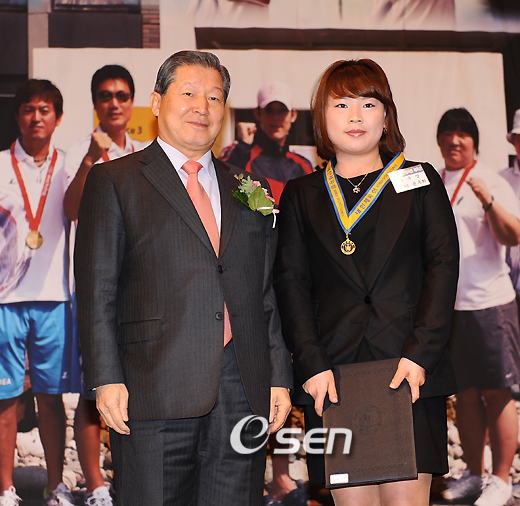 제55회 대한체육회 체육상 시상식이 19일 오전 서울 광장동 워커힐호텔에서 열렸다. 베이징올림픽에서 금메달을 획득한 야구 대표팀이 대상을 수상했고 남녀 최우수상은 경기부문에서 수영 박태환(단국대)과 역도 장미란(고양시청), 지도 부문에서는 역도의 오승우 전 국가대표 감독(현 제주특별자치도청 감독)이 받았다. 또 공로부문 최우수상은 김용우 전 대한인라인롤러연맹회장과 문병용 강원대 스포츠과학부 교수가, 심판부문은 문상희 한국중고유도연맹 심판위원장, 연구 부문은 김범식 성균관대 스포츠과학부 교수가 각각 뽑혔다. 우수상은 피겨 김연아(고려대)를 비롯해 20명과 2팀이, 장려상은 탁구 당예서(대한항공) 등 44명과 9개 팀이 받았다. 우수상을 수여한 양궁 윤옥희가 이연택 대한체육회장과 포즈를 취하고 있다./김영민 기자ajyoung@osen.co.kr