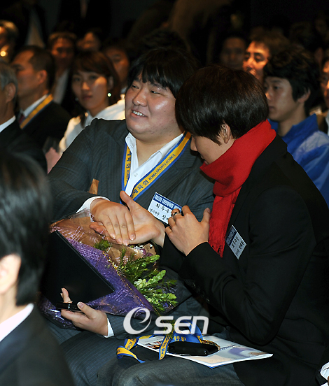 제55회 대한체육회 체육상 시상식이 19일 오전 서울 광장동 워커힐호텔에서 열렸다. 베이징올림픽에서 금메달을 획득한 야구 대표팀이 대상을 수상했고 남녀 최우수상은 경기부문에서 수영 박태환(단국대)과 역도 장미란(고양시청), 지도 부문에서는 역도의 오승우 전 국가대표 감독(현 제주특별자치도청 감독)이 받았다. 또 공로부문 최우수상은 김용우 전 대한인라인롤러연맹회장과 문병용 강원대 스포츠과학부 교수가, 심판부문은 문상희 한국중고유도연맹 심판위원장, 연구 부문은 김범식 성균관대 스포츠과학부 교수가 각각 뽑혔다. 우수상은 피겨 김연아(고려대)를 비롯해 20명과 2팀이, 장려상은 탁구 당예서(대한항공) 등 44명과 9개 팀이 받았다. 남녀 최우상을 수상한 장미란과 박태환이 악수를 나누고 있다./김영민 기자ajyoung@osen.co.kr