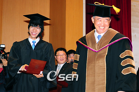가수 이승기가 빛나는 대학 졸업장을 받았다. 20일 오전 서울 동국대학교 '2009 봄 학위 수여식'에 참석한 그는 모교 이미지를 높이는 데 이바지한 공로로 '총장 공로상'을 수상했다. 국제통상학과 2005년 학번인 이승기는 방송활동과 학업을 병행하며 휴학 없이 4년 만에 대학을 마쳤다. 공로상을 수여 받은 이승기가 선물을 받지 않고 나가자 동국대학총장이 선물을 전해주며 웃음을 터트리고 있다./윤민호 기자ymh@osen.co.kr