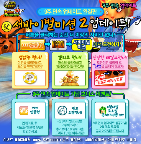 ㈜나우콤(대표 김대연, 문용식)이 서비스하고 ㈜라온엔터테인먼트(대표 박재숙)가 개발한 캐주얼게임 ‘테일즈런너’(http://tr.nopp.co.kr)가 대규모 9주 연속 업데이트 완결판 ‘서바이벌 미션2’를 26일 업데이트한다. ‘서바이벌 미션2’는 테일즈런너만의 독창성이 돋보이는 맵으로 유저들로부터 가장 많은 사랑을 받고 있는 ‘서바이벌 모드’의 몬스터 어택 부분을 특화한 미션이다. 이는 테일즈런너의 방해 몬스터들인 문어 아빠, 마도로스 죠, 도마뱀 삼촌의 총공격이 감행되는 미션으로 총 9단계로 구성되어 있다. 미션은 기록 기준에 따라 일반 미션 클리어와 상급 마스터 클리어로 나누어져 있어, 신규 유저들에게는 새로운 재미를 그리고 고수 유저들에겐 마스터 클리어에 대한 도전 욕구를 불러일으킬 것으로 기대되어진다. 미션 클리어 혜택도 푸짐하다. 먼저 일반 미션 클리어 한 유저에겐 TR(테일즈런너 게임머니)이 지급되고, 마스터 클리어 한 유저들에겐 팜에 설치할 수 있는 몬스터 동상이 지급되어 미션 완료에 대한 자부심을 상징할 수 있도록 하였다. 또한 주어진 9개의 미션을 모두 클리어 한 유저들은 도마뱀 삼촌과 문어삼촌의 협공이 이루어지는 신 맵 ‘삼촌과 아빠의 협공’을 플레이 할 수 있다. 한편, 9주 연속 업데이트 성공을 기념하여 2월 28일 토요일엔 공짜아이템을 지급하는 보너스 이벤트가 진행된다. 공짜아이템은 28일 자정부터 선착순 20만명의 유저들에게 지급되며, 유저들은 15종의 캐시아이템을 모두 무료로 받을 수 있다. 나우콤 심진식PM은 “겨울방학을 맞이하여 야심차게 선보인 대규모 9주 연속 업데이트가 여러분들의 관심과 성원에 힘입어 드디어 마지막에 이르렀다”며, “신 맵, 신 캐릭터 등 다양한 영역에 걸쳐 진행된 업데이트로 한층 업그레이드 된 즐거움을 선사할 것이다”고 밝혔다. 자세한 사항은 테일즈런너 공식 홈페이지(http://tr.nopp.co.kr))에서 확인할 수 있다. 영상으로 만나는 게임 세상 - 게임무빙닷컴제공 보도자료 bodo@gamemoving.com OSEN 엔터테인먼트팀 osenstar@osen.co.kr