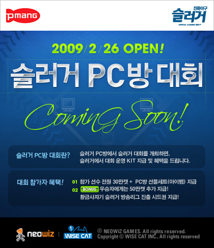 ㈜네오위즈게임즈(대표 최관호)는 자사 게임포털 피망에서 서비스하고, ㈜와이즈캣(대표 남민우)이 개발한 온라인 야구게임 ‘슬러거’에서 ‘슬러거 PC방 대회’를 개최한다고 26일 밝혔다. ‘슬러거 PC방 대회’는 사전 개최 인증을 받은 슬러거 가맹 PC방이 대회를 개최하는 방식으로, 매달 대회가 진행되며 3월 대회는 3월 13일부터 31일까지 진행된다. 이번 대회는 슬러거 유저라면 누구나 참가할 수 있으며, 2월 26일부터 3월 30일까지 해당 슬러거 홈페이지에서 참가 신청을 하면 된다. 참가자들은 토너먼트 방식으로 실력을 겨루게 되며, 대회 우승자에게는 슬러거 상위리그 진출 시드권과 게임머니(80만캣)를 부상으로 제공하고, 참가자 전원에게도 게임머니(30만캣)와 게임아이템이 들어있는 ‘슬러거 선물세트’를 증정한다. 개최하는 PC방에게는 대회가 원활히 진행될 수 있도록 대회 시스템을 지원하고, 게임머니와 실물경품을 선물로 증정할 예정이다. 네오위즈게임즈 심준형 서비스마케팅 그룹장은 “슬러거 PC방 대회는 매달 진행되는 규모있는 행사로 유저들이 쉽게 참여해 실력을 겨뤄볼 수 있는 기회”라며 “야구를 사랑하는 유저들의 많은 참여를 부탁 드린다”고 말했다. ‘슬러거 PC방 대회’에 대한 보다 자세한 사항은 슬러거 홈페이지(http://slugger.pmang.com)에서 확인 할 수 있다. 영상으로 만나는 게임 세상 - 게임무빙닷컴제공 보도자료 bodo@gamemoving.com OSEN 엔터테인먼트팀 osenstar@osen.co.kr