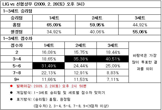 [배구토토] 국내 배구팬들은 2008~2009프로배구 LIG 손해보험-신협 상무전을 대상으로 한 배구토토 매치 22회차 게임에서 홈팀 LIG의 1,2세트 우세를 전망했다. 스포츠토토 공식 온라인 발매사이트인 베트맨(www.betman.co.kr)은 오는 28일 오후 3시에 치러지는 2008~2009프로배구 LIG-신협상무전을 대상으로 한 배구토토 매치 22회차 게임 투표율 중간집계 결과 홈팀 LIG의 1, 2세트 승리를 점친 참가자가 많았다고 밝혔다. 1~3세트 승리팀과 점수차를 알아맞히는 배구토토 매치 22회차 게임에서 예상 승리팀은 1세트 LIG 65.09%, 2세트 LIG 59.95%로 1, 2세트 모두 LIG의 승리가 많았다. 반면, 3세트는 원정팀 신협상무의 우세를 점친 참가자가 55.06%로 많았다. 3세트까지의 각 세트별 예상 점수차는 1세트의 경우 5~6점(31.49%), 7~8점(22.13%)을 전망한 참가자가 많았고, 2세트는 3~4점(35.38%), 5~6점(24.44%), 3세트는 3~4점(40.51%)과 5~6점(25.09%) 순으로 예상 비율이 높았다. 베트맨 관계자는 "국내 배구팬들은 2008~2009시즌 후반기 라운드에서 상위권 도약을 노리고 있는 LIG의 우세를 점치고 있다"며 "라운드 마다 강팀들을 잡아 배구팬들에게 기쁨을 주고 있는 신협상무가 또 한번의 이변을 연출할 수 있을 지 큰 관심"이라고 밝혔다. 한편 이번 배구토토 매치 22회차 게임은 28일 오후 2시 50분에 발매가 마감된다. '즐거운 스포츠, 즐거운 토토'(http://www.betman.co.kr)