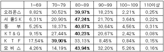 [농구토토] 국내 농구팬들은 오는 28일 오후에 벌어지는 2008-2009 프로농구 부산 KTF-울산 모비스전에서 모비스의 우세를 전망했다. 스포츠토토 공식 온라인 발매 사이트인 베트맨(www.betman.co.kr)은 오는 28일 오후 3시부터 펼쳐지는 대구 오리온스-서울 SK, 원주 동부-안양 KT&G, 부산 KTF-울산 모비스전 등 국내 프로농구 3경기를 대상으로 한 농구토토 스페셜 13회차 투표율 중간집계 결과 80~89점대가 43.94%로 1순위를 차지한 모비스가 70~79점대(39.90%)에 머무른 KTF를 상대로 10점차 이상의 완승을 거둘 것으로 전망했다고 밝혔다. 반면, 1경기 오리온스-SK전과 2경기 동부-KT&G에서는 각 팀이 모두 80점대를 기록할 것이라는 예상이 최다 투표를 차지해 승부를 알 수 없는 10점차 이내 박빙승부를 예고했다. 특히 2경기 동부-KT&G전 경우 동부(80~89점대 40.87%)와 KT&G(80~89점대 40.23%)의 1순위 득점대 투표율이 거의 비슷하게 집계돼 회차 최고의 접전을 전망했다. 스포츠토토 관계자는 "농구팬들은 리그 선두 동부의 뒤를 바짝 추격하고 있는 모비스가 KTF를 누르고 선두 자리에 한 걸을 다가갈 것으로 전망했다"며 "농구팬들의 예상대로 모비스가 KTF에 10점차 이상의 완승을 거두고 선두 추격의 고삐를 당길 수 있을지 그 결과에 관심이 집중되고 있다"고 밝혔다. 한편 이번 농구토토 스페셜 13회차 게임은 경기시작 10분 전인 28일 오후 2시 50분에 발매가 마감된다. '즐거운 스포츠, 즐거운 토토'(http://www.betman.co.kr)